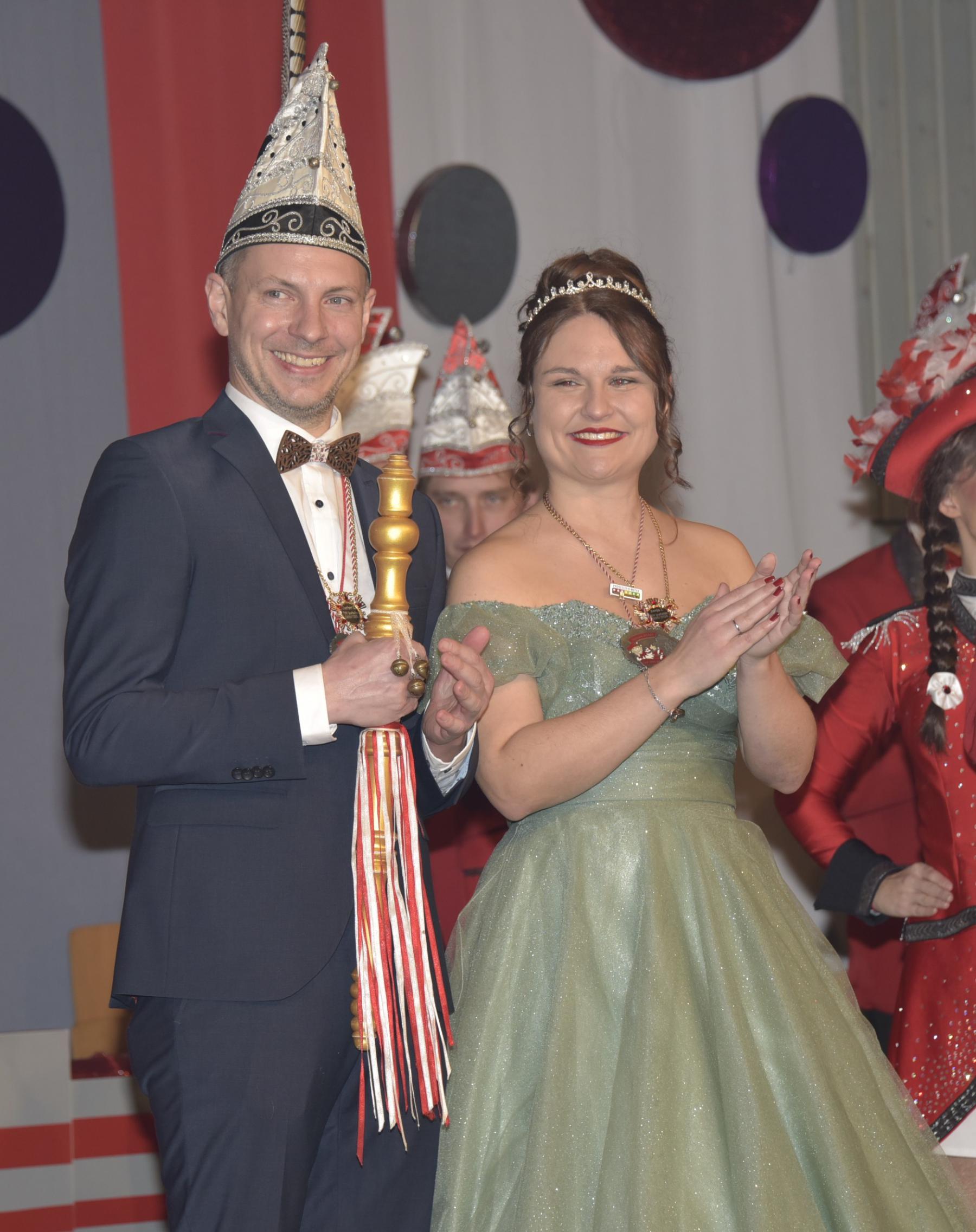 Sonja I. und Jochen II. strahlten als Prinzenpaar bei ihrer Begrüßung um die Wette und stimmten die Gäste mit ihrer Rede auf einen beschwingten Abend ein.